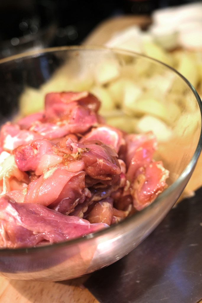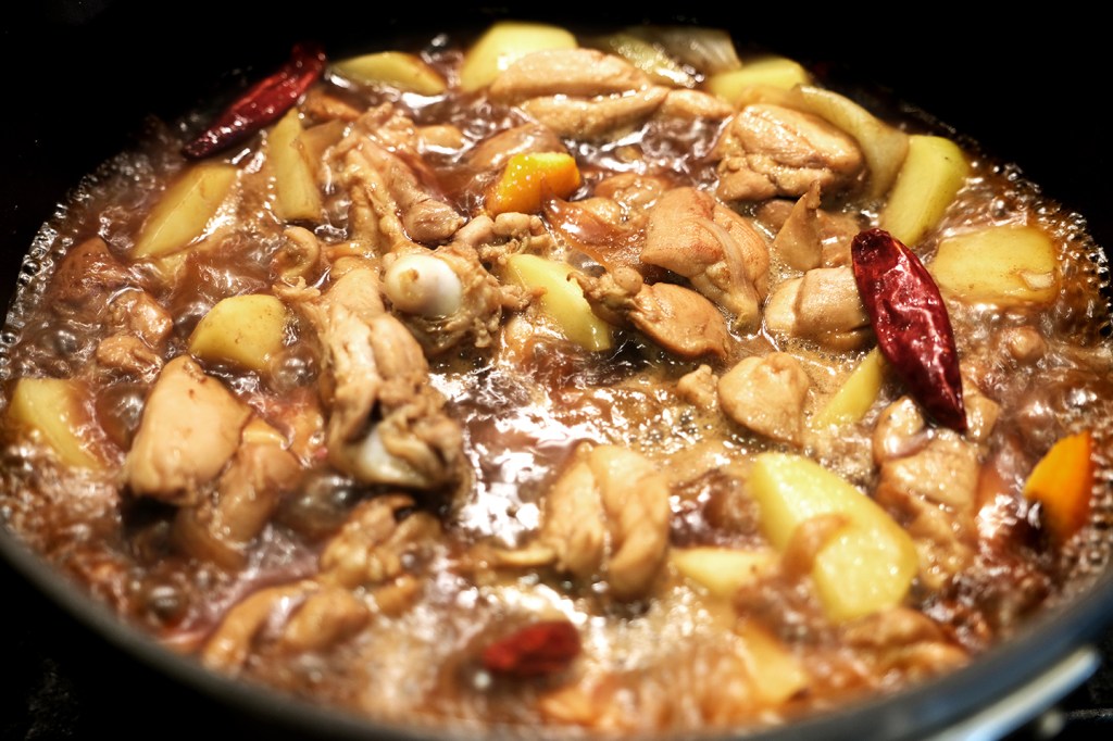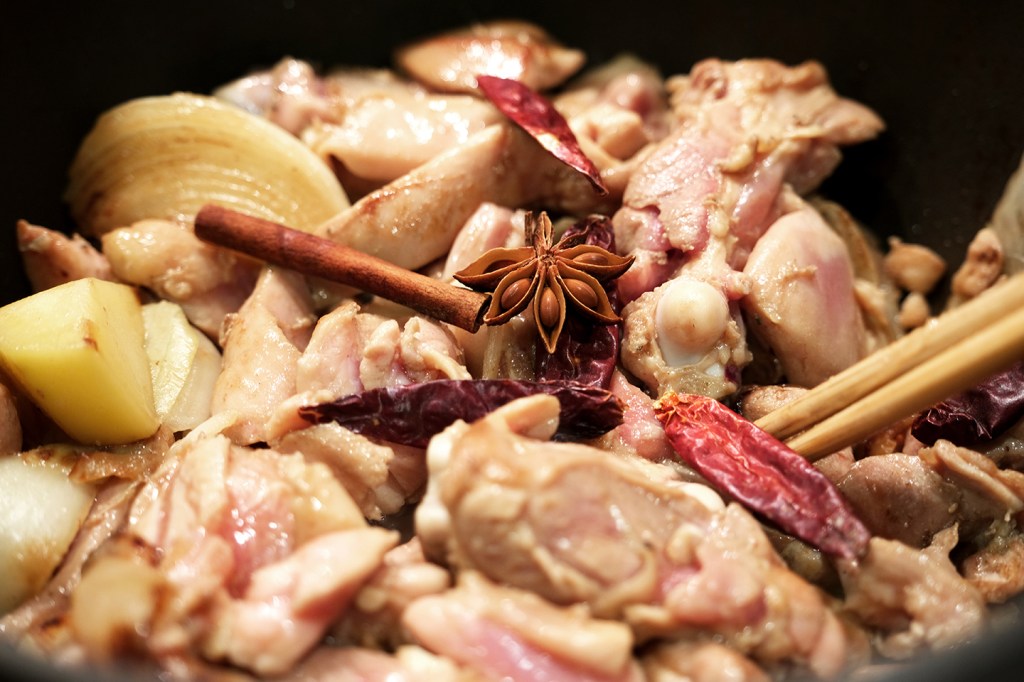 Heat a large-lipped pan with olive oil. Saute onion with minced ginger and garlic on high. Sprinkle Chinese prickly ash, salt and pepper. Add chicken into the mix with a splash of rice cooking wine. Sear the chicken for several minutes before adding in orange peel, lemon slice, cinnamon stick, star anise, and dried red peppers. Saute on high for 10 minutes, mixing intermittently to prevent sticking.