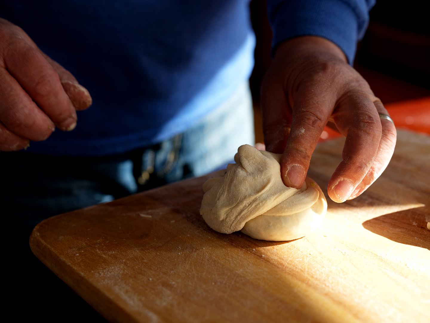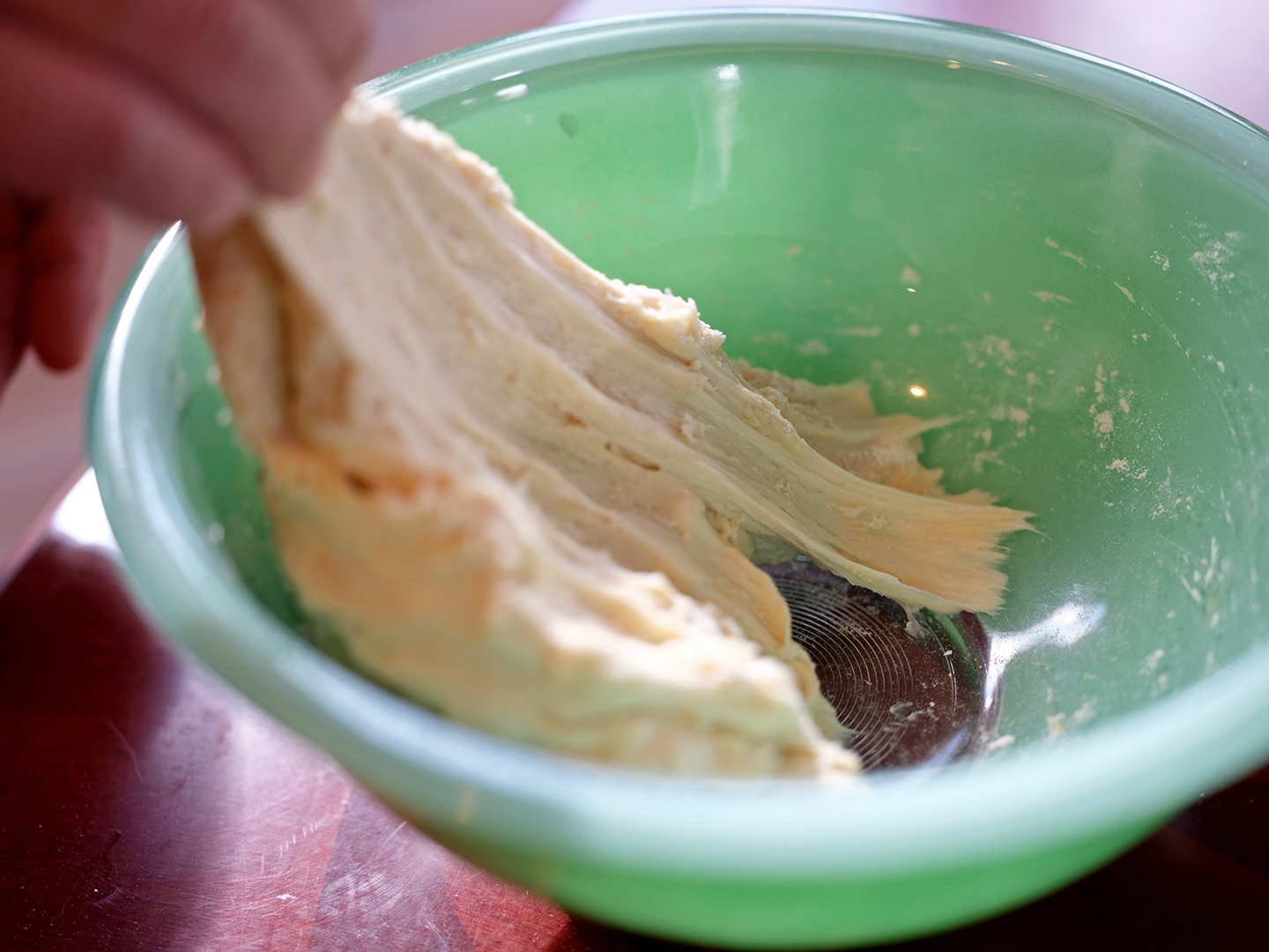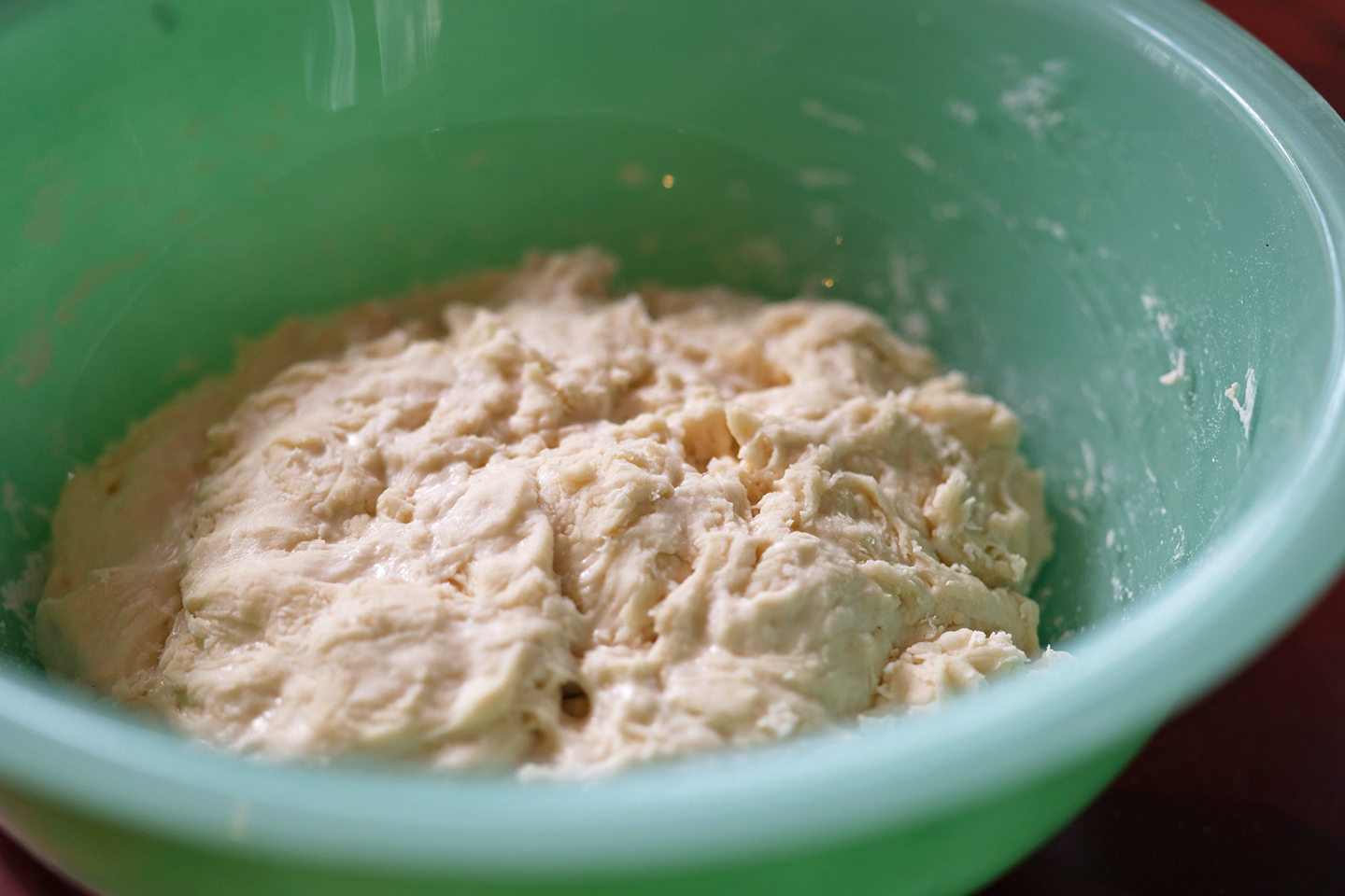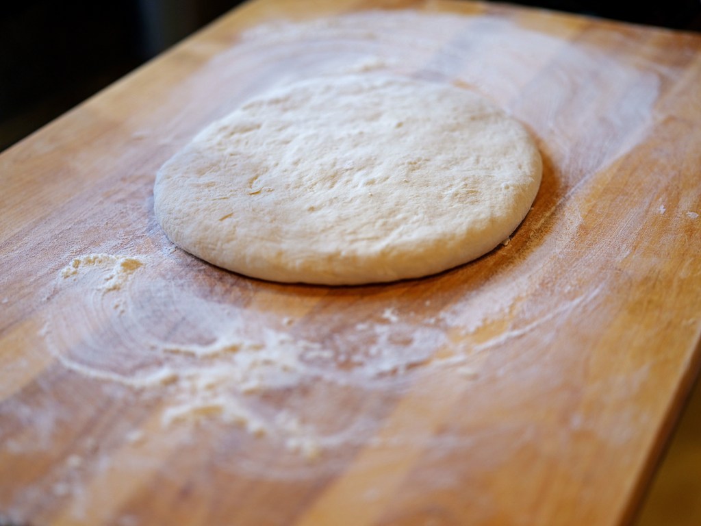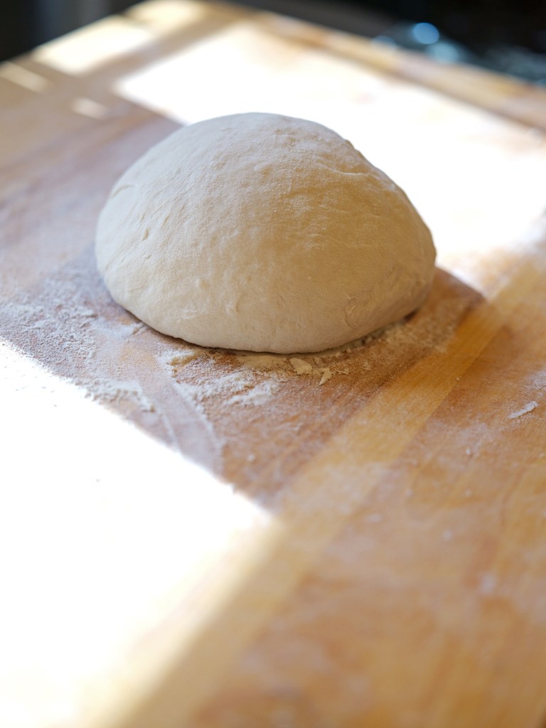 Place raw dough on a clean surface or cutting board, dusted liberally with flour. Knead the dough for 5 minutes, dusting with flour as you knead. The final ball of dough should be dry to the touch, but still have some bounce.