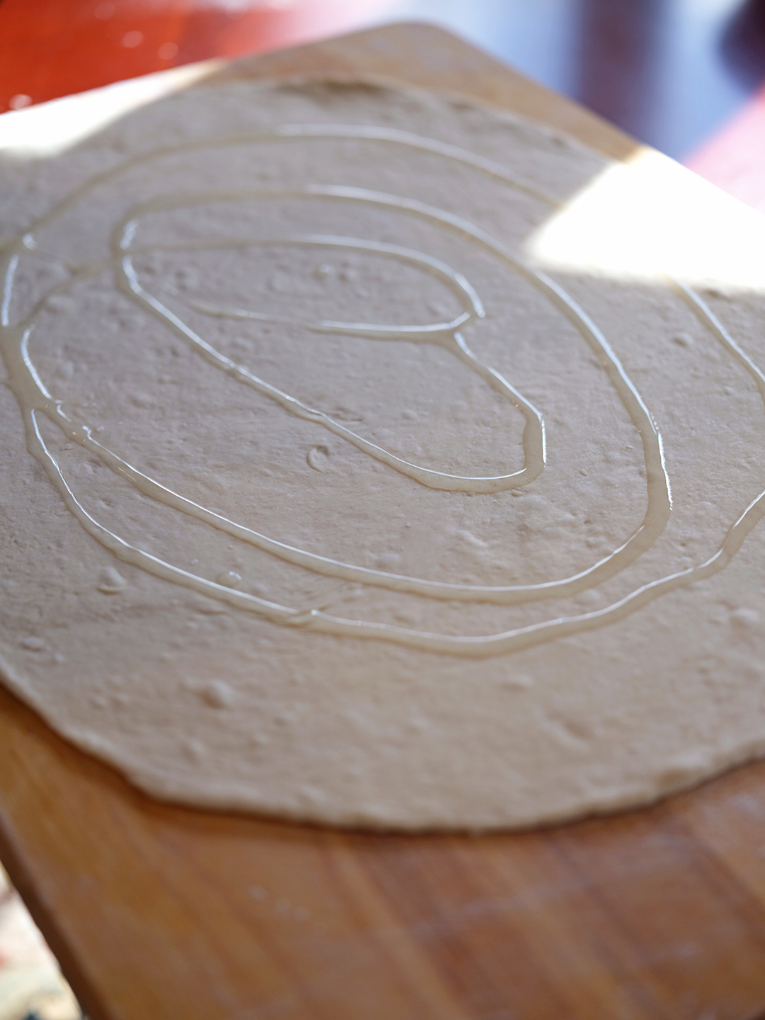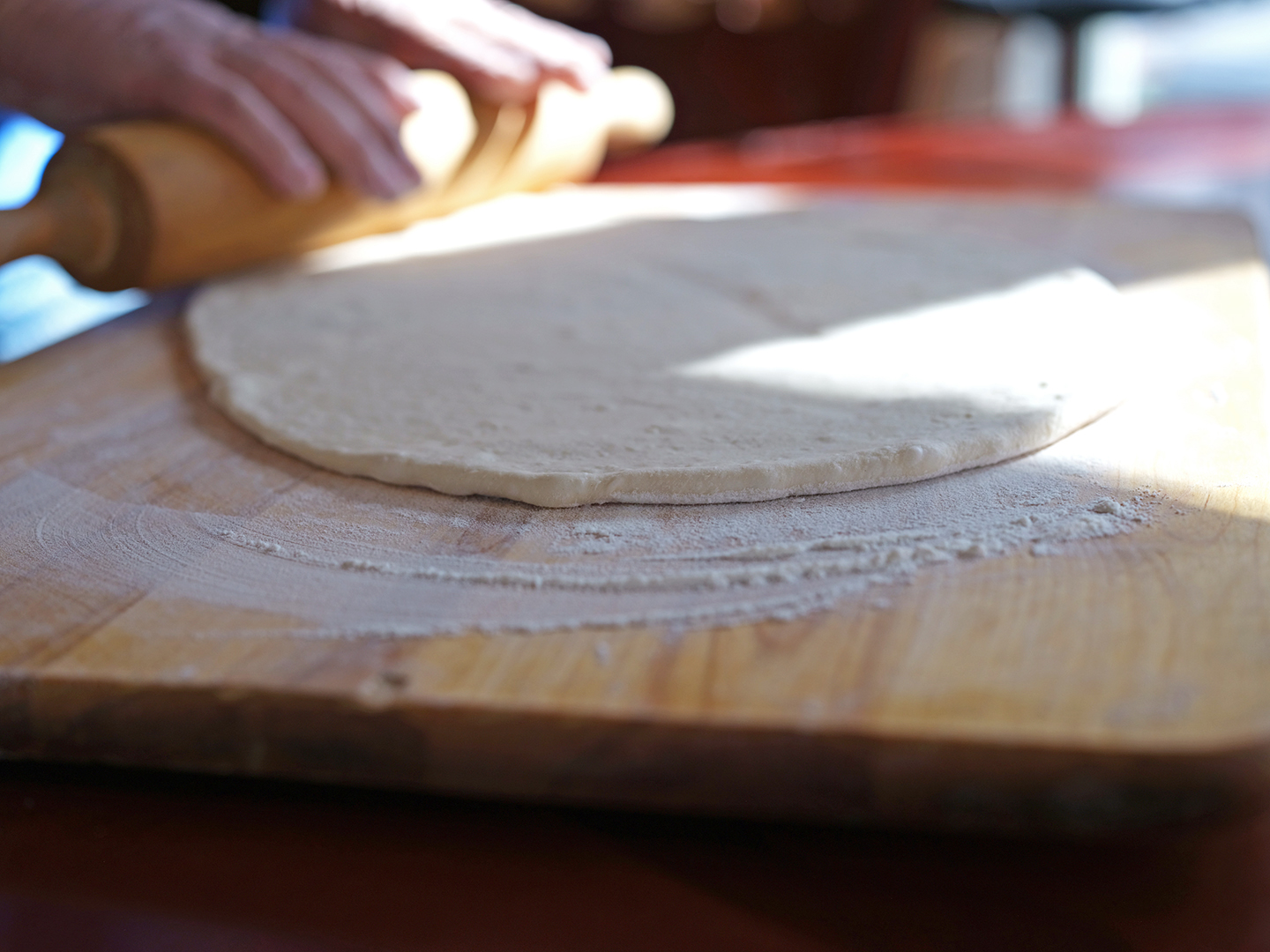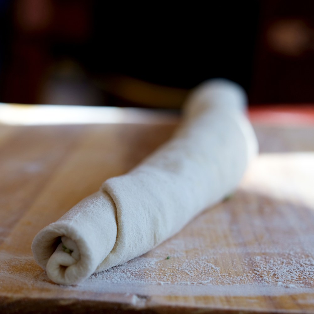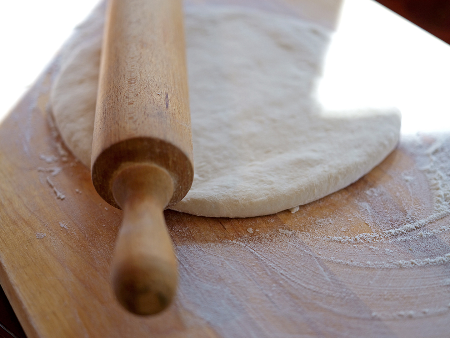 Complete dough flattening with rolling pin to the shape of a large rectangle. Flatten evenly to 1/4″ deep.