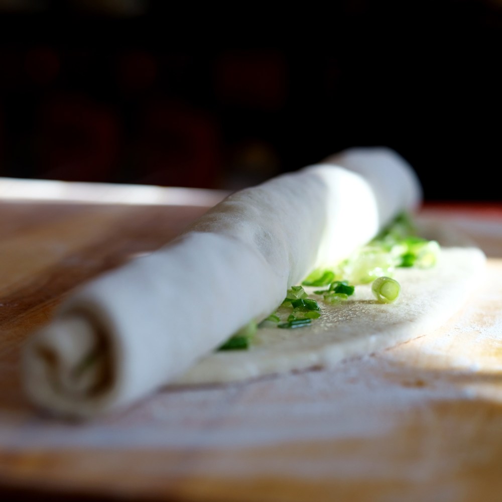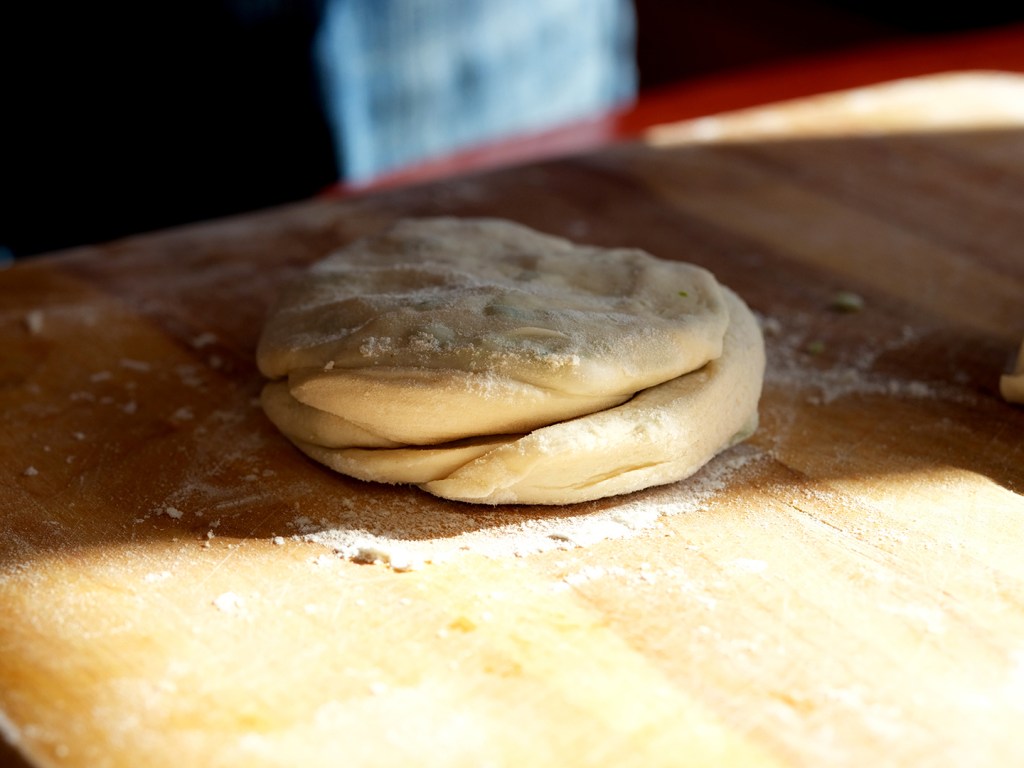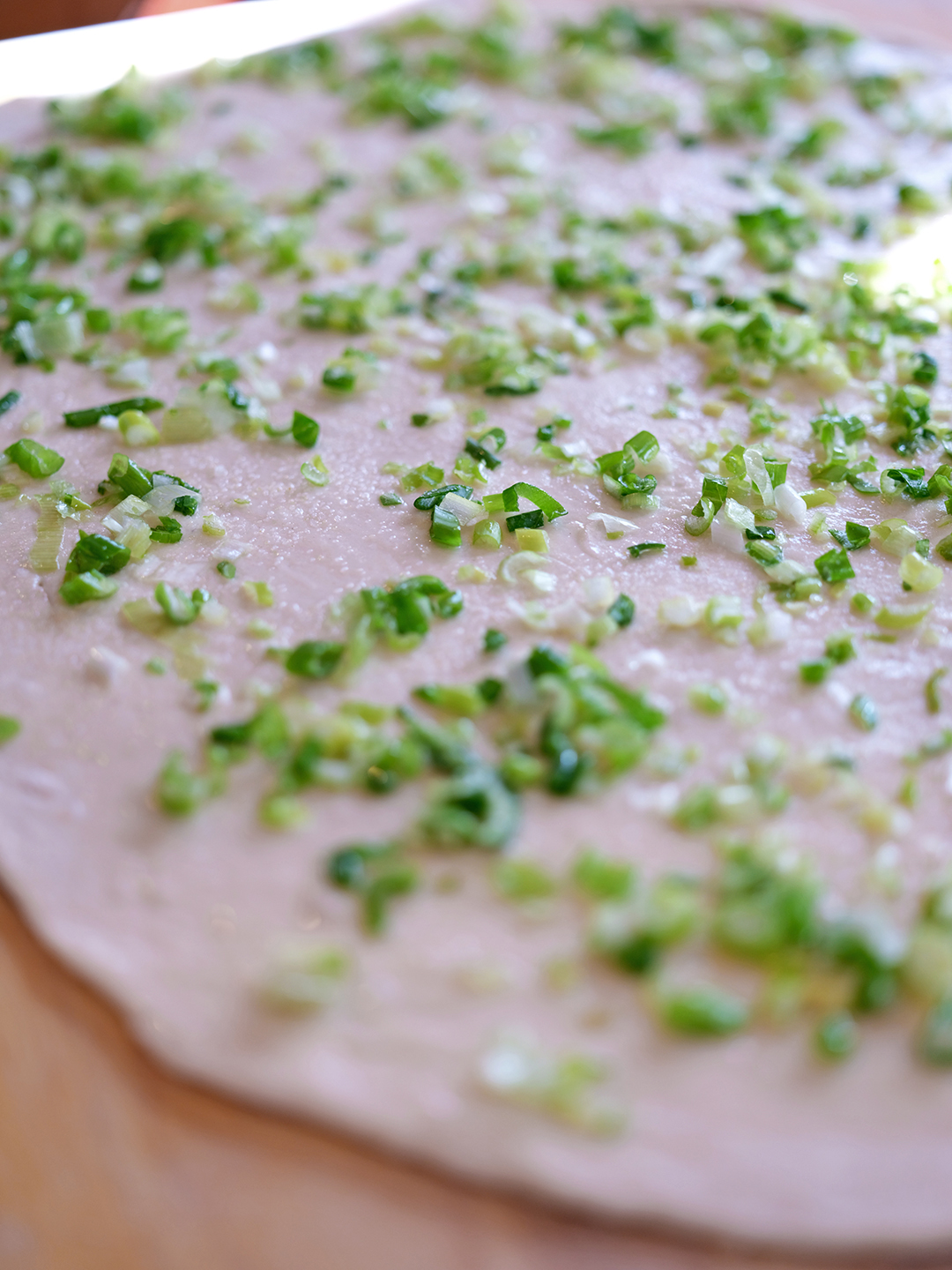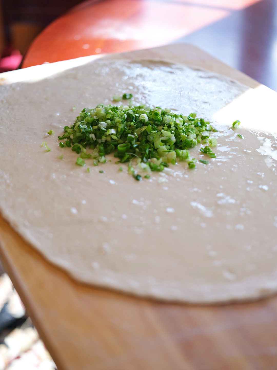 Then, finish the flattening of the pancake with your rolling pin. Depth of pancake should be approximately 2/3″, and ideally the scallion mixture will not be protruding out from your dough.
