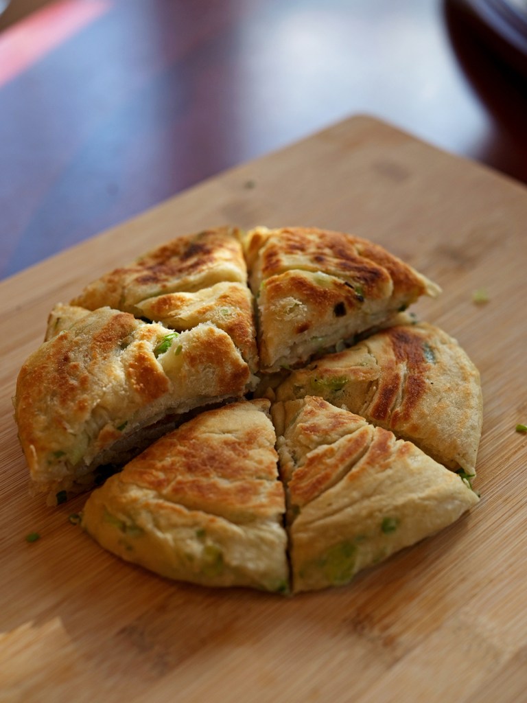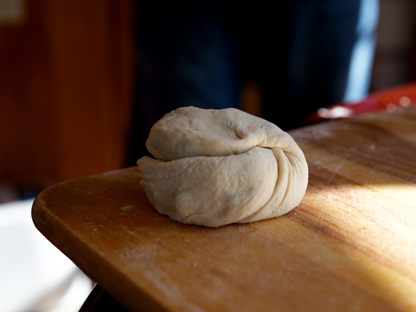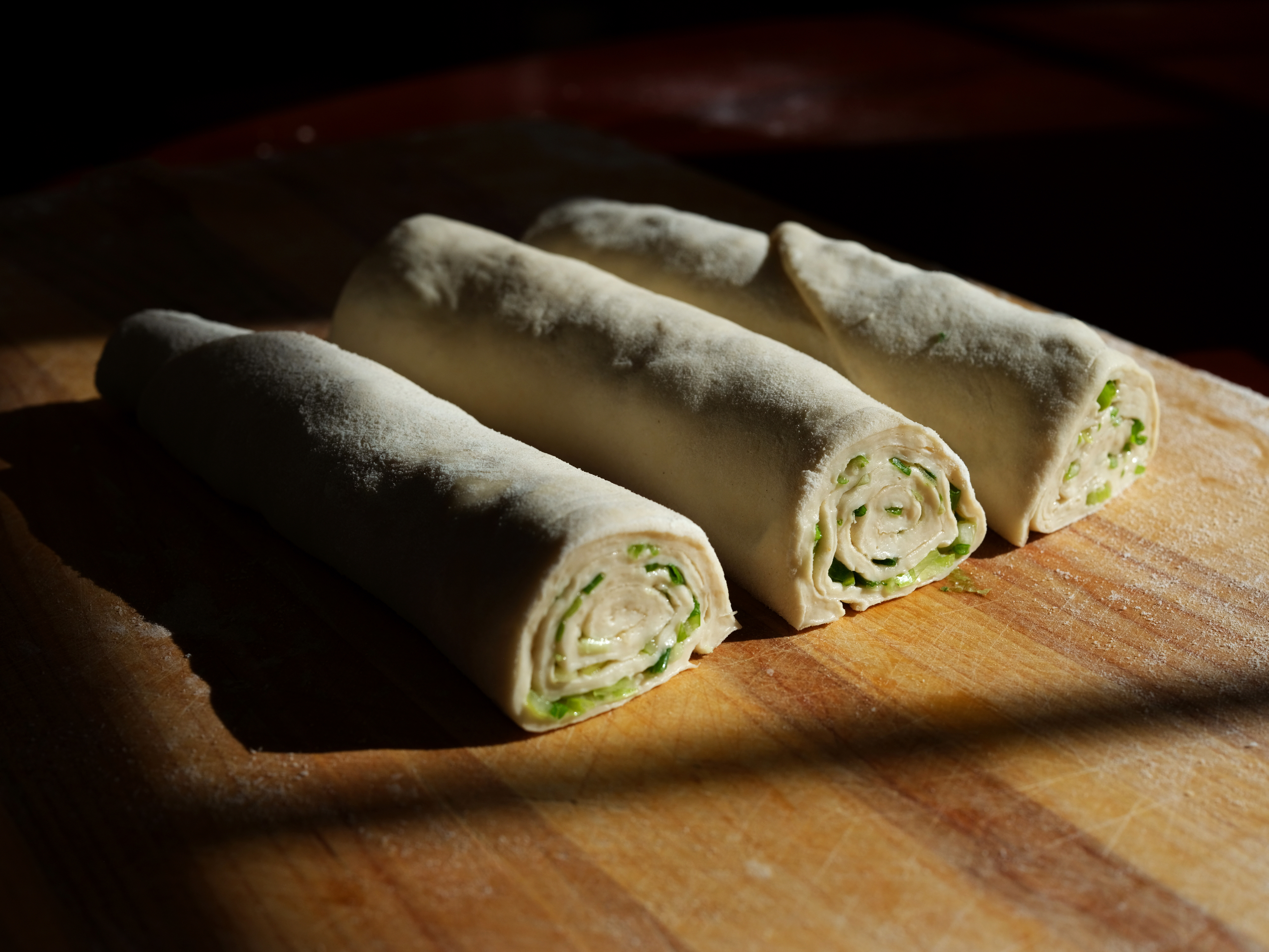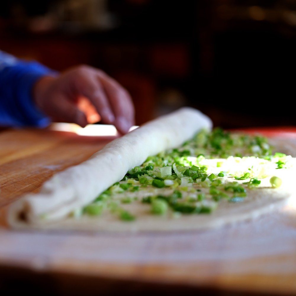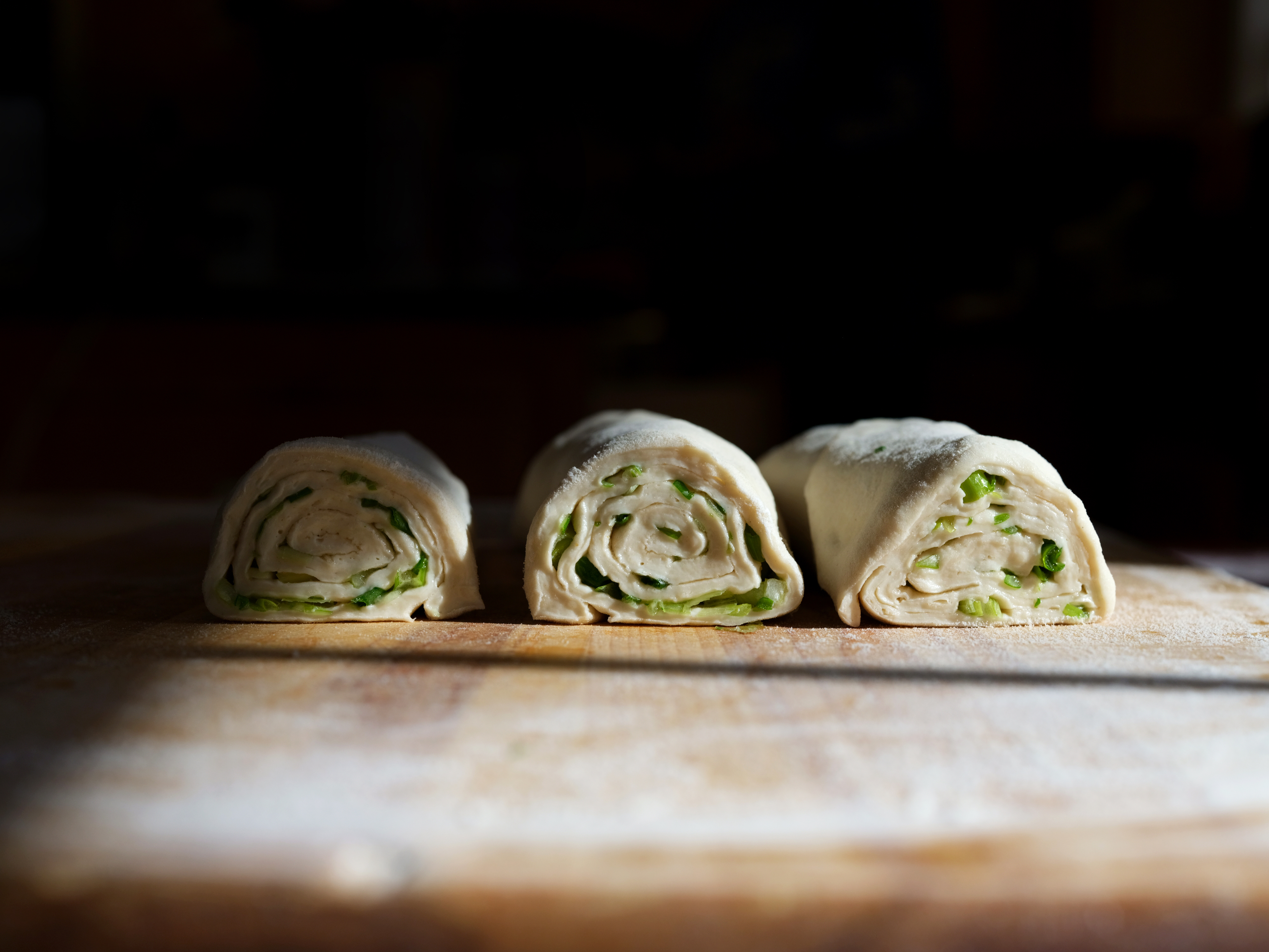 Then, finish the flattening of the pancake with your rolling pin. Depth of pancake should be approximately 2/3″, and ideally the scallion mixture will not be protruding out from your dough.