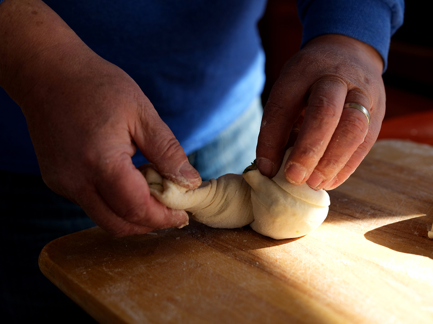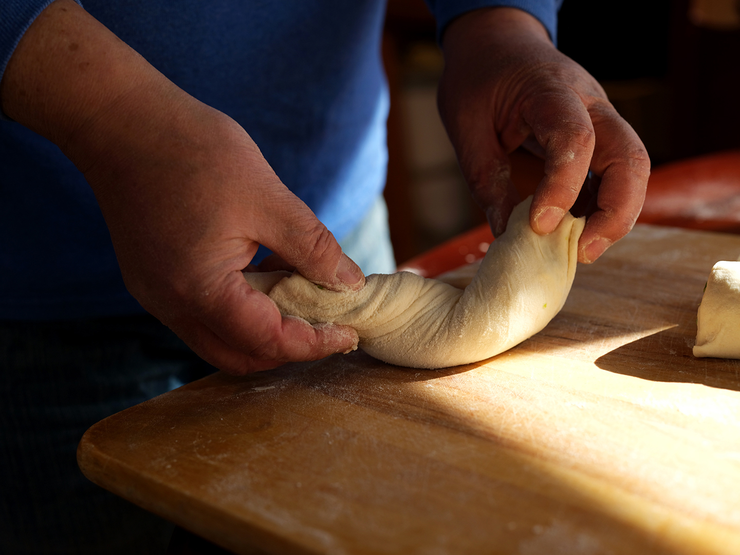 Take each section one by one, twisting the dough along the longer side of each section, and then neatly tuck open ends together to close the loop, folding carefully down into the top of the twist. Ideally, there will be no open sections showing.