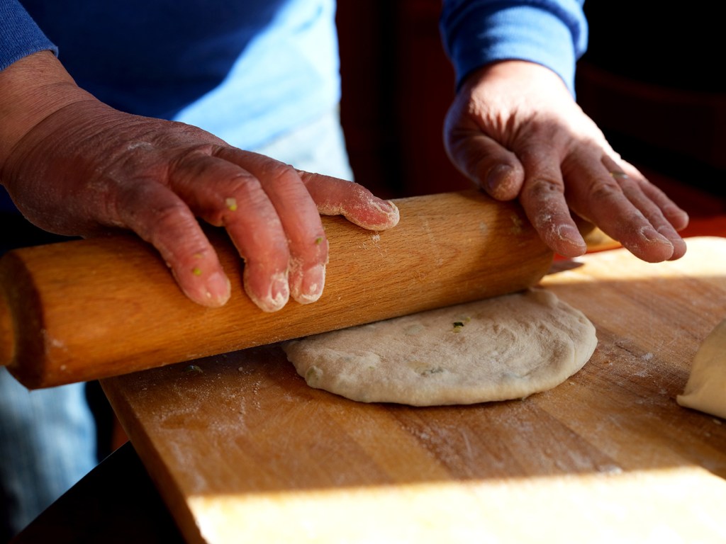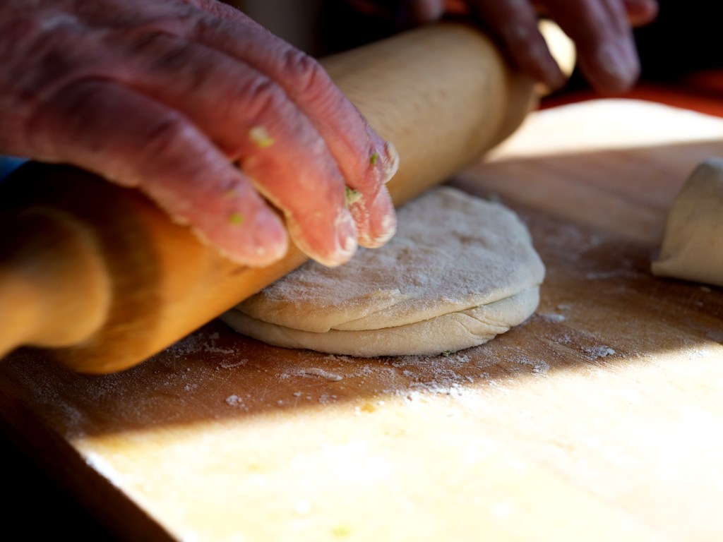 Dust the working surface with flour again. Flatten the ball first with your hands.