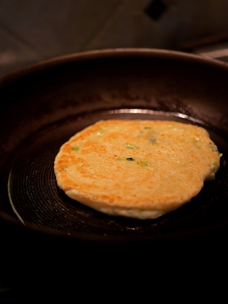 Oil and heat a pan with medium flame. Cook one side of pancake very briefly to begin the crisping process; flip after 15 seconds. Proceed to cook pancake covered for 2 minutes on each side, or until golden.