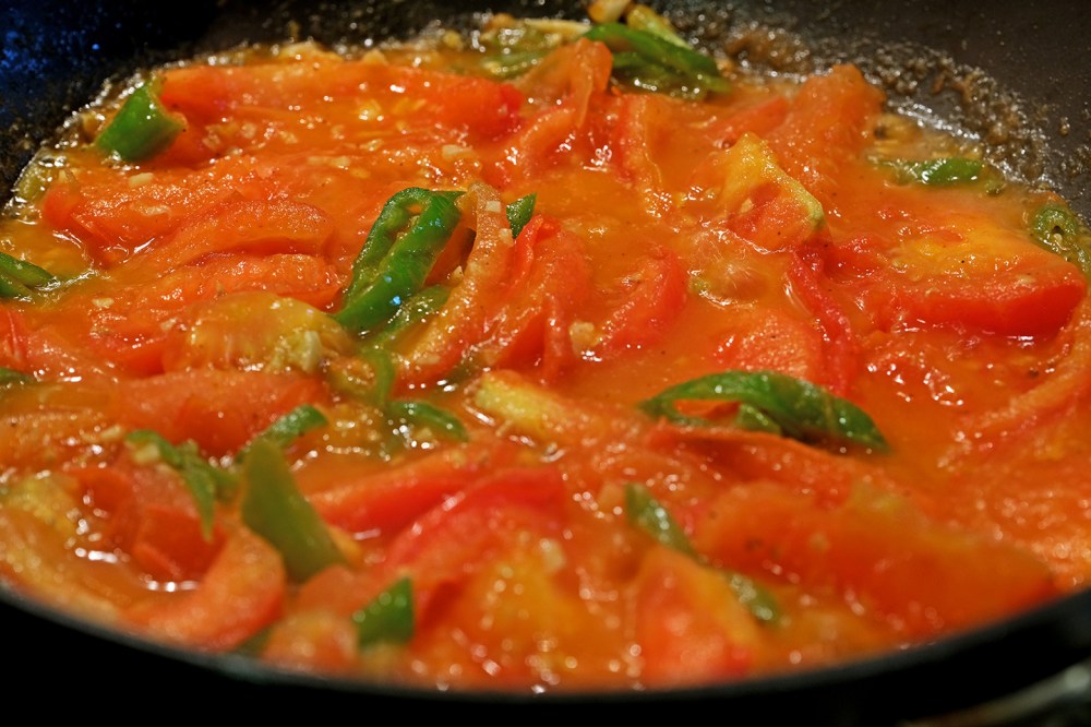 The tomato skin will start to wilt off the tomatoes as they begin losing their firm shape. Stay by the flame and flip tomatoes regularly for about 5 minutes. Add salt for taste. The goal is to achieve very soft tomatoes while simultaneously bringing out the natural juices from the vegetables, creating a delicious sauce for your dish.
