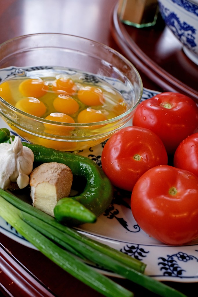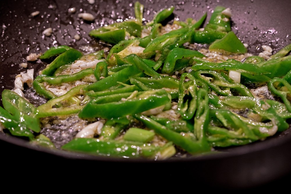 Clean the same pan briefly with water and a paper towel, removing eggy residue. Heat a splash of olive oil to saute minced ginger, garlic, and sliced peppers over a medium flame for approximately 2 minutes. Sprinkle salt and pepper.