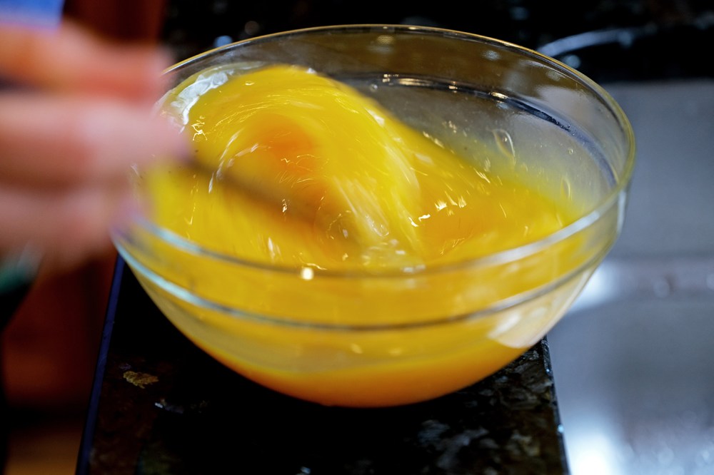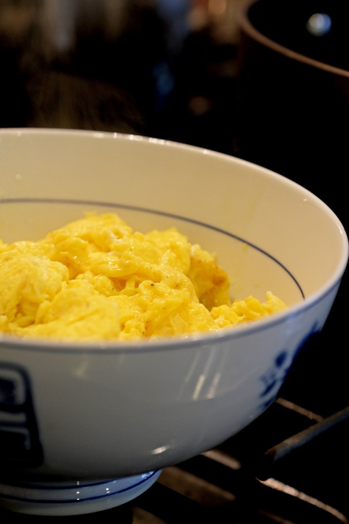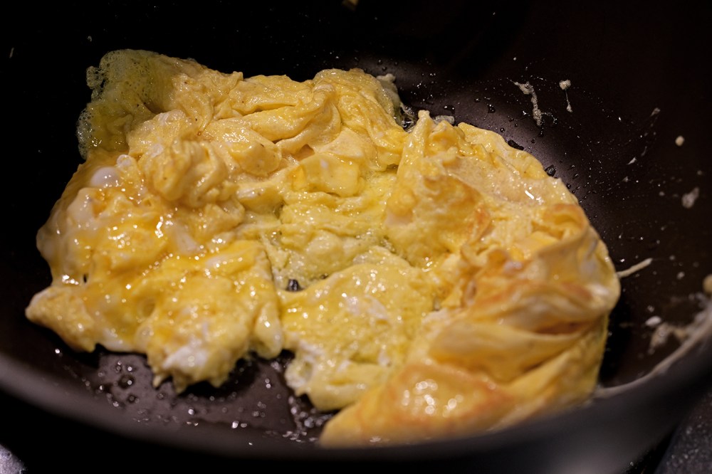 Move the mostly-cooked eggs into a separate bowl and repeat the process for the remaining eggs. The purpose of the dual process is to allow for even, quick cooking and preventing overcooking the eggs in this initial phase. If you use less eggs or have a pan with a larger surface area, you may not need to repeat the process.