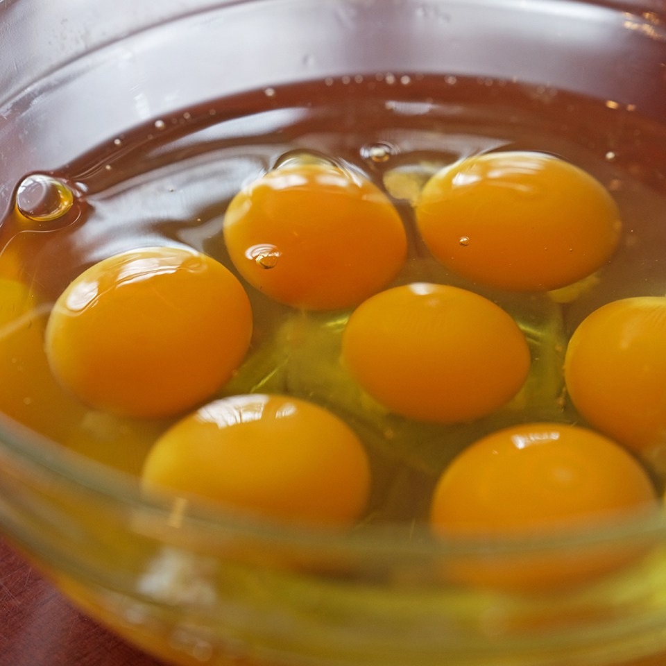 Heat a large-lipped pan and coat liberally with olive oil. Ensure the oil is well-heated and moves easily across the pan before slowly pouring half of the egg mixture into the pan. The eggs will cook quickly. Manage the process by allowing the bottom layer of the eggs to cook briefly and shift the mixture until 90% cooked through.