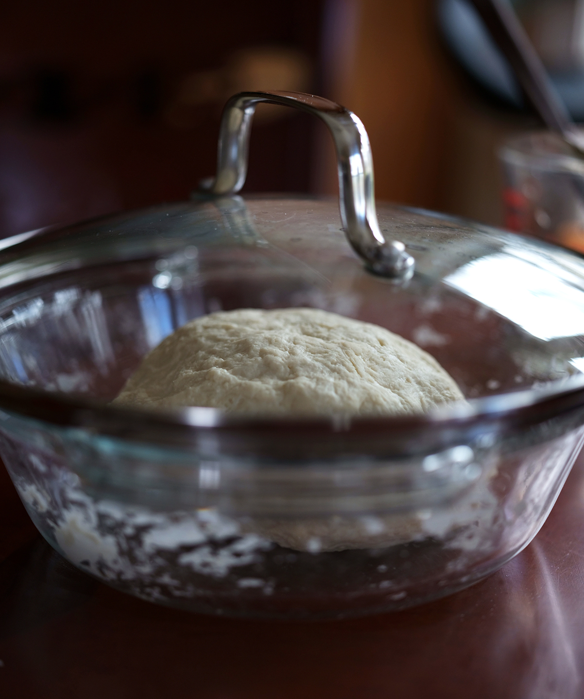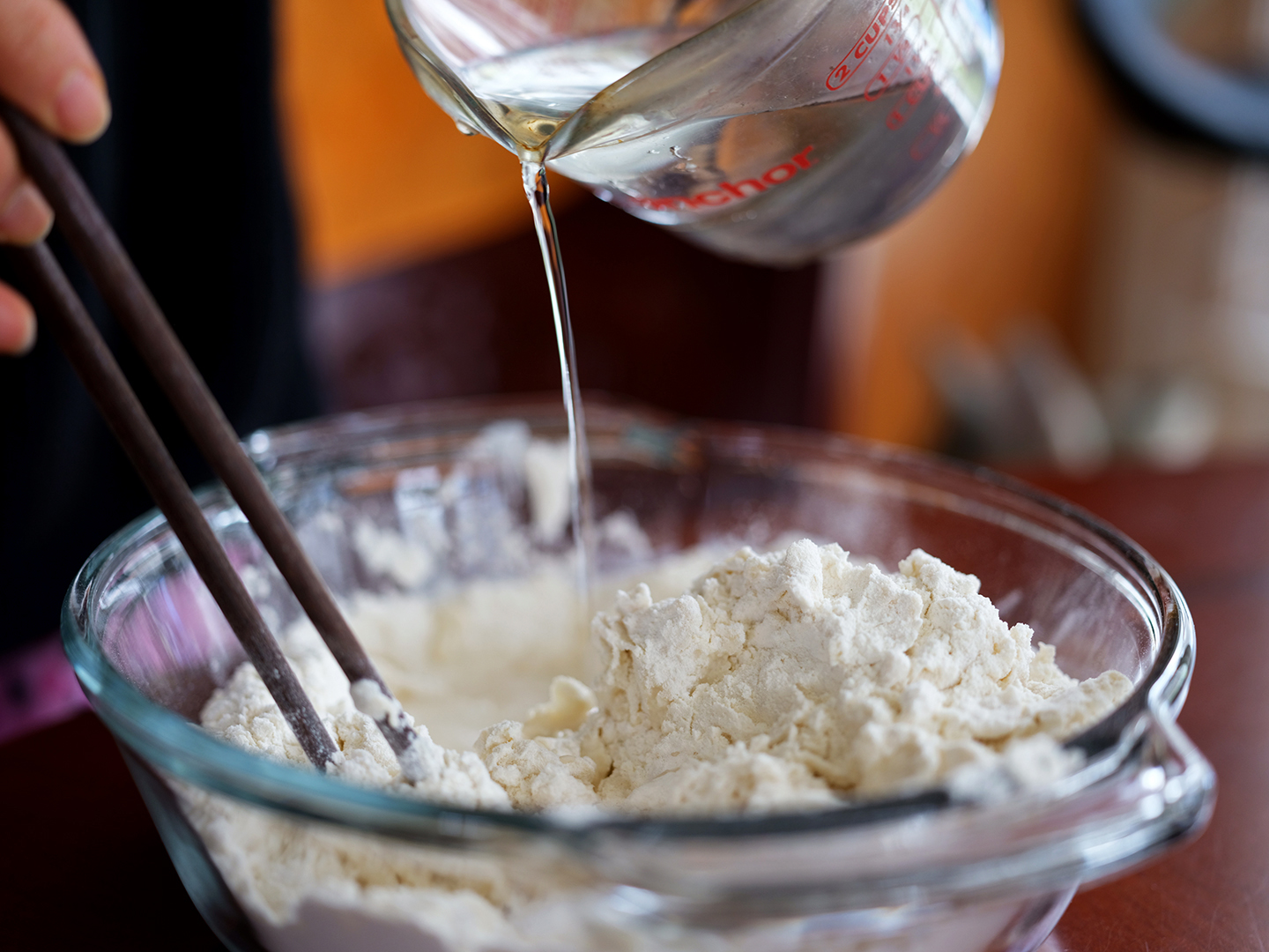 In a large bowl, start with 3 cups of all-purpose flour. Add 1 cup of lukewarm water in increments until a dough is created. Let the dough sit for 30 minutes, covered.