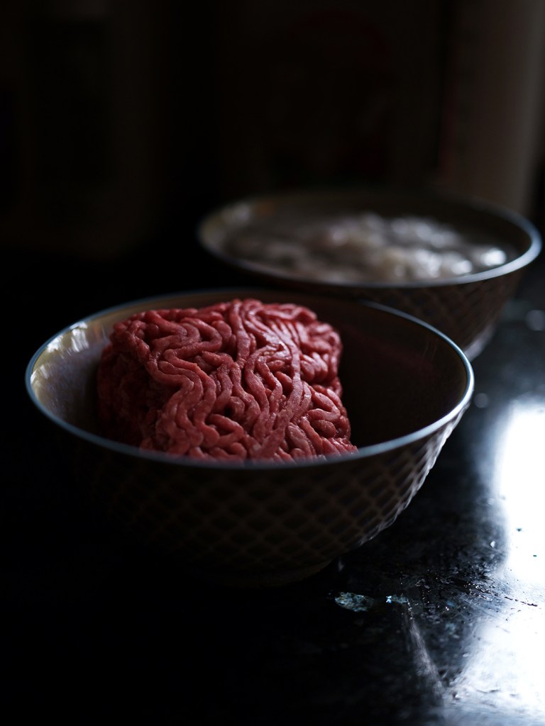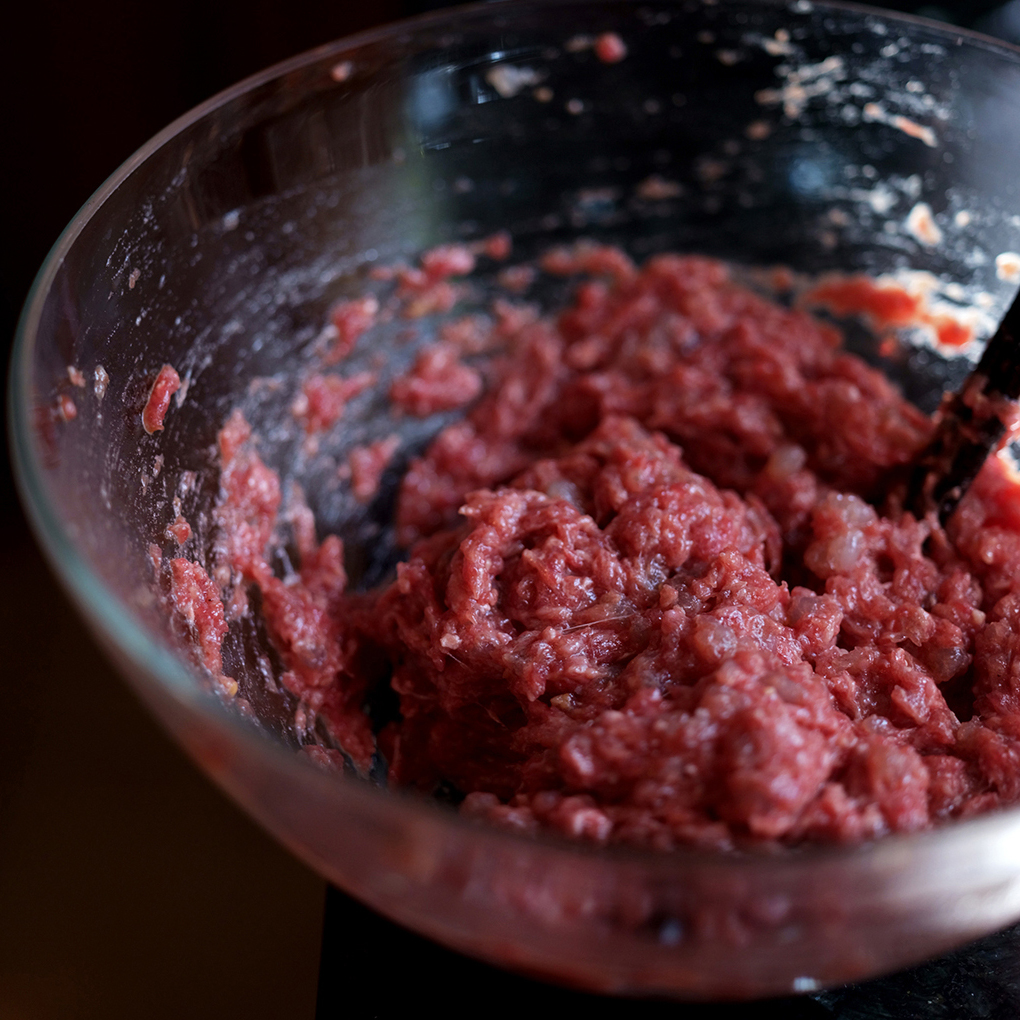 While waiting for the dough, prepare your meat filling. The higher the fat content of the meat, the more delicious your dumplings will be. For this particular recipe, we used an 80% lean ground beef selection based on what we had available. This is a fun twist on a more traditional ground pork mixture.