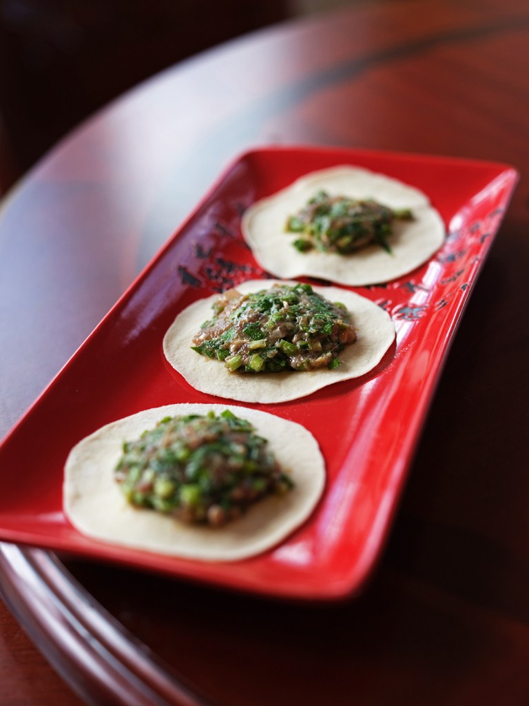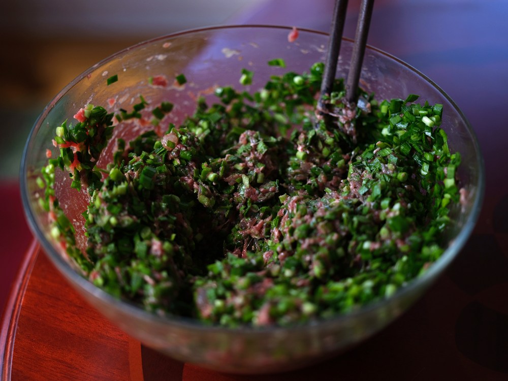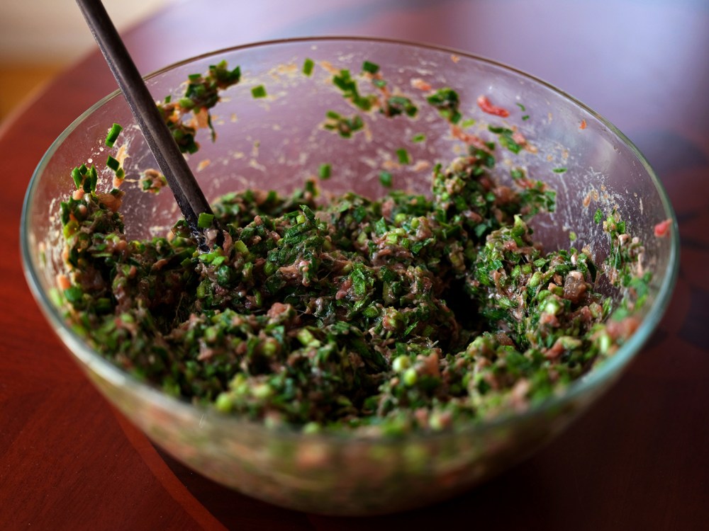 Stir in chives to the meat mixture. The texture of the filling should be pasty and sticky, and easy to push around, but maintain its form. If it’s too thick, add minor increments of water and vegetable oil, and again mix in a one-directional method with vigor.