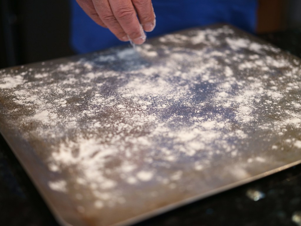 Dust a baking pan liberally with flour to prepare the waiting area for the ready-to-cook dumplings.