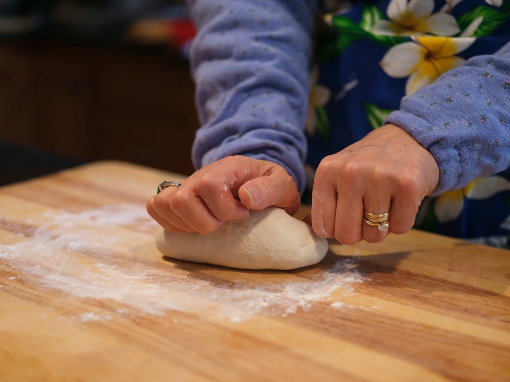 Make this ball into a doughnut, working the doughnut hole larger and larger. Powder the doughnut and continue to expand it until the dough’s diameter is approximately 1 inch.