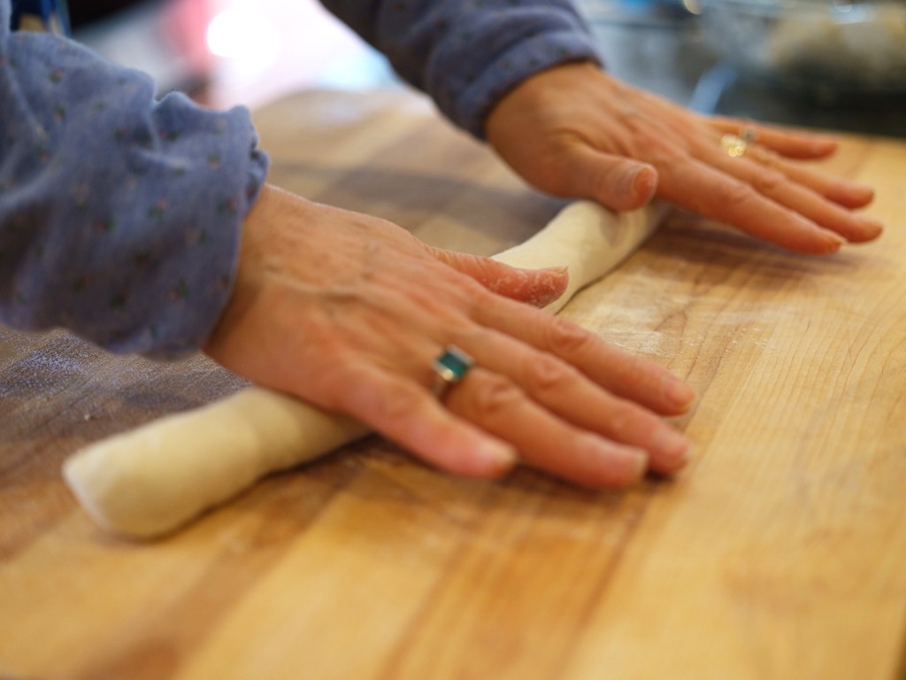 Cut into 1/2″ segments, dusting all sides liberally in flour after cutting.
