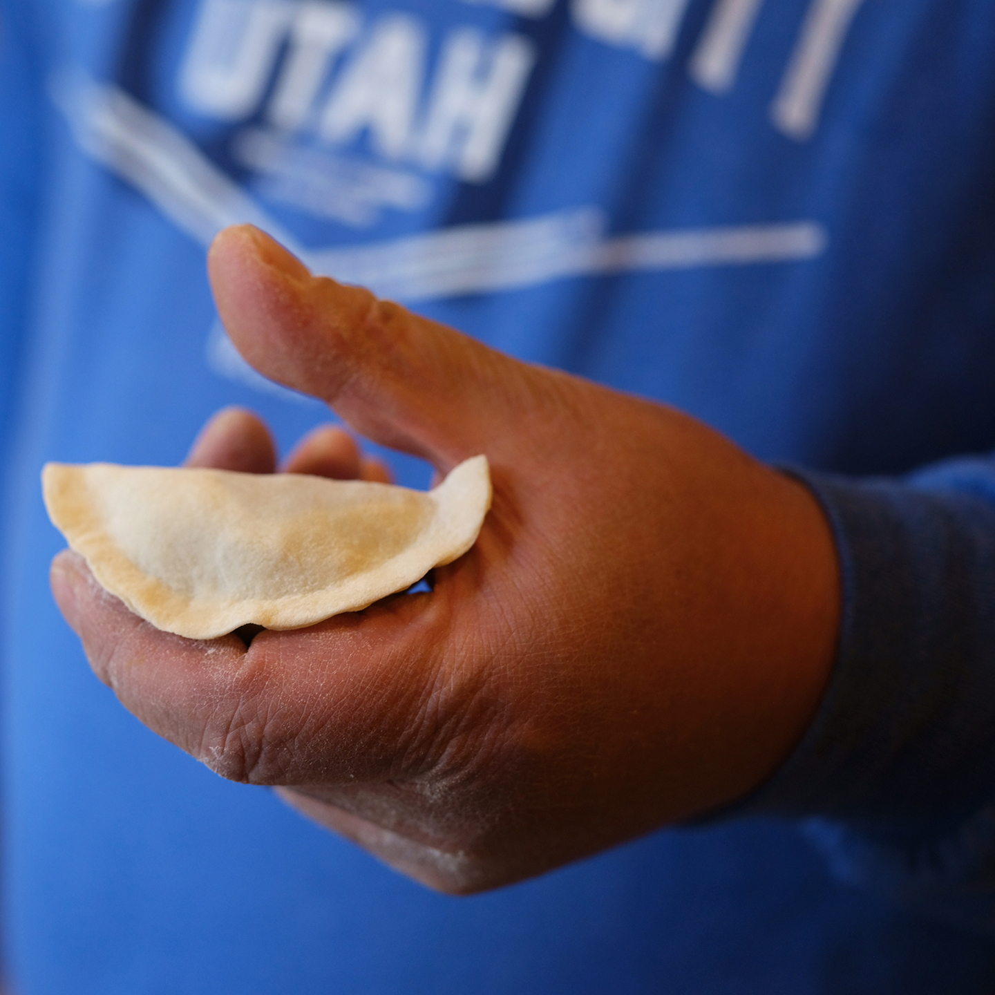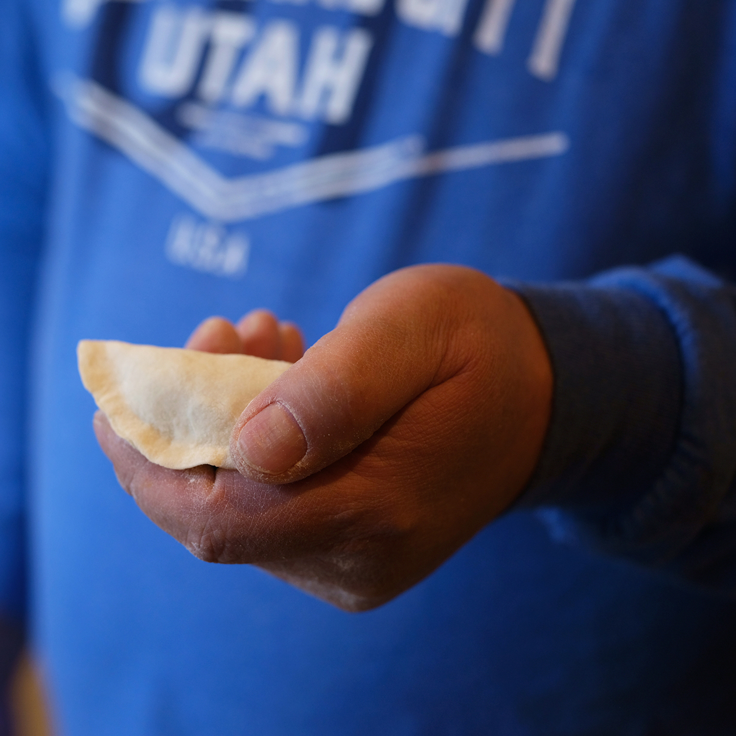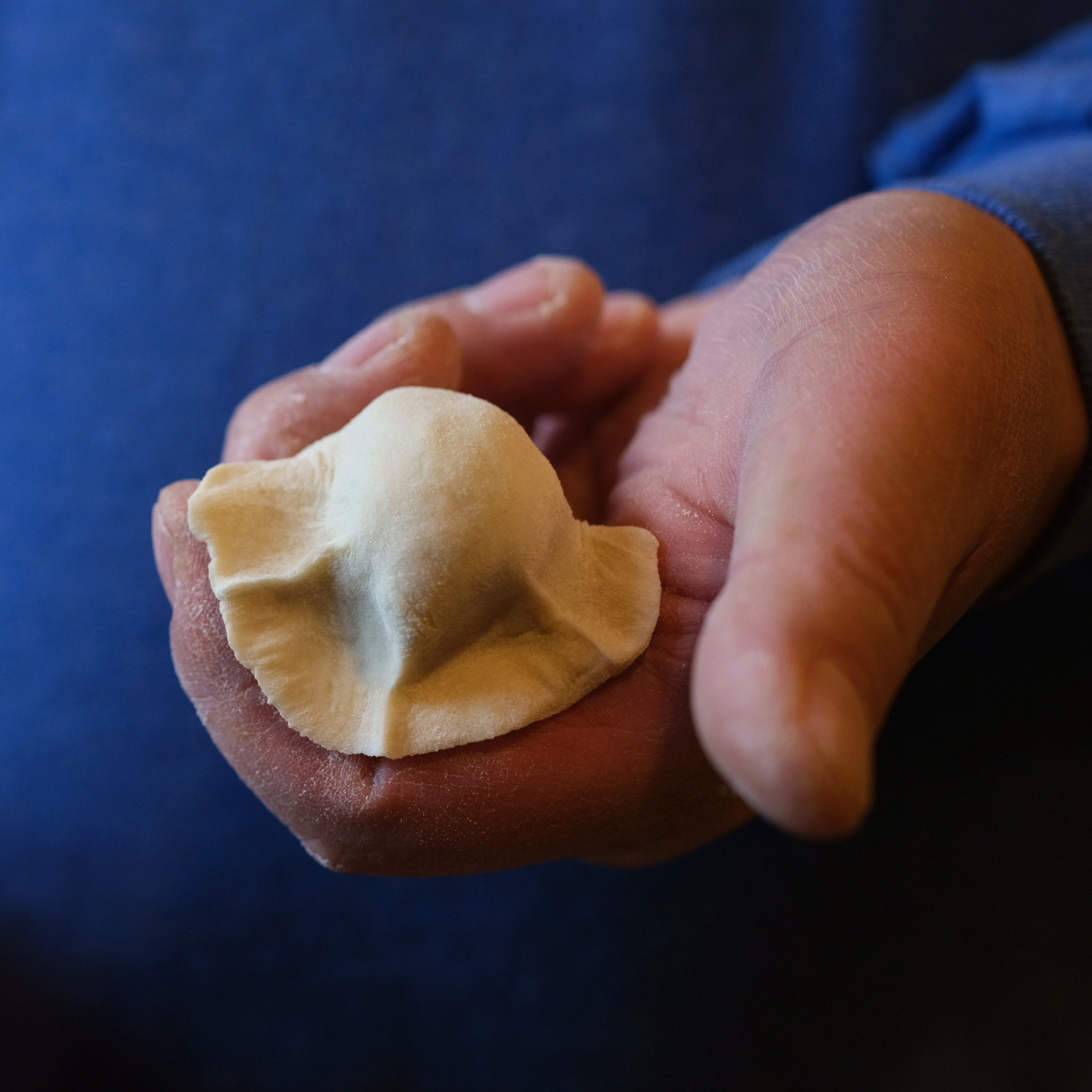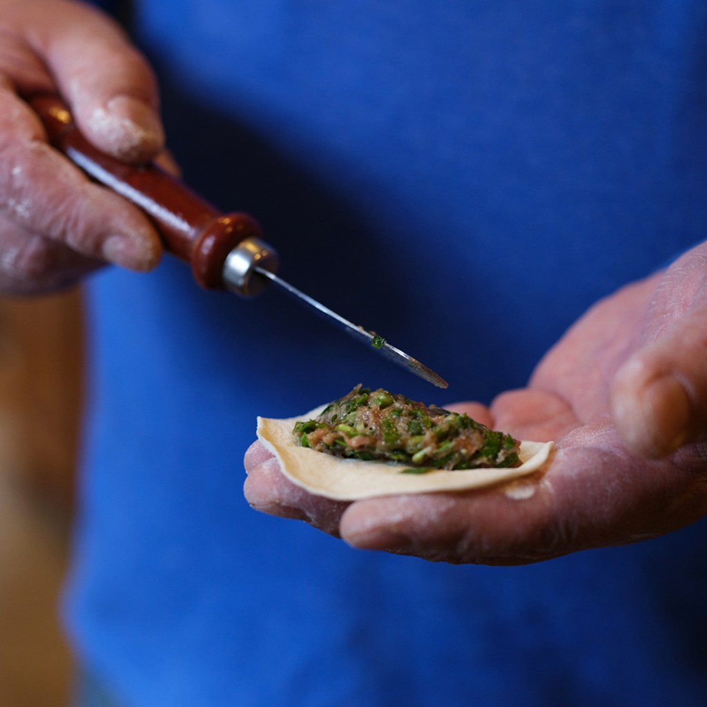 Technically, this pinching method alone should suffice. However, for a super-secure fold, we like to double down with the following technique: place folded dumpling edge flatly along your left index finger, pressing firmly with your thumbs to secure contact of the crust. Pinch down and push the belly of the dumpling together; this will make a rounder shaped dumpling.