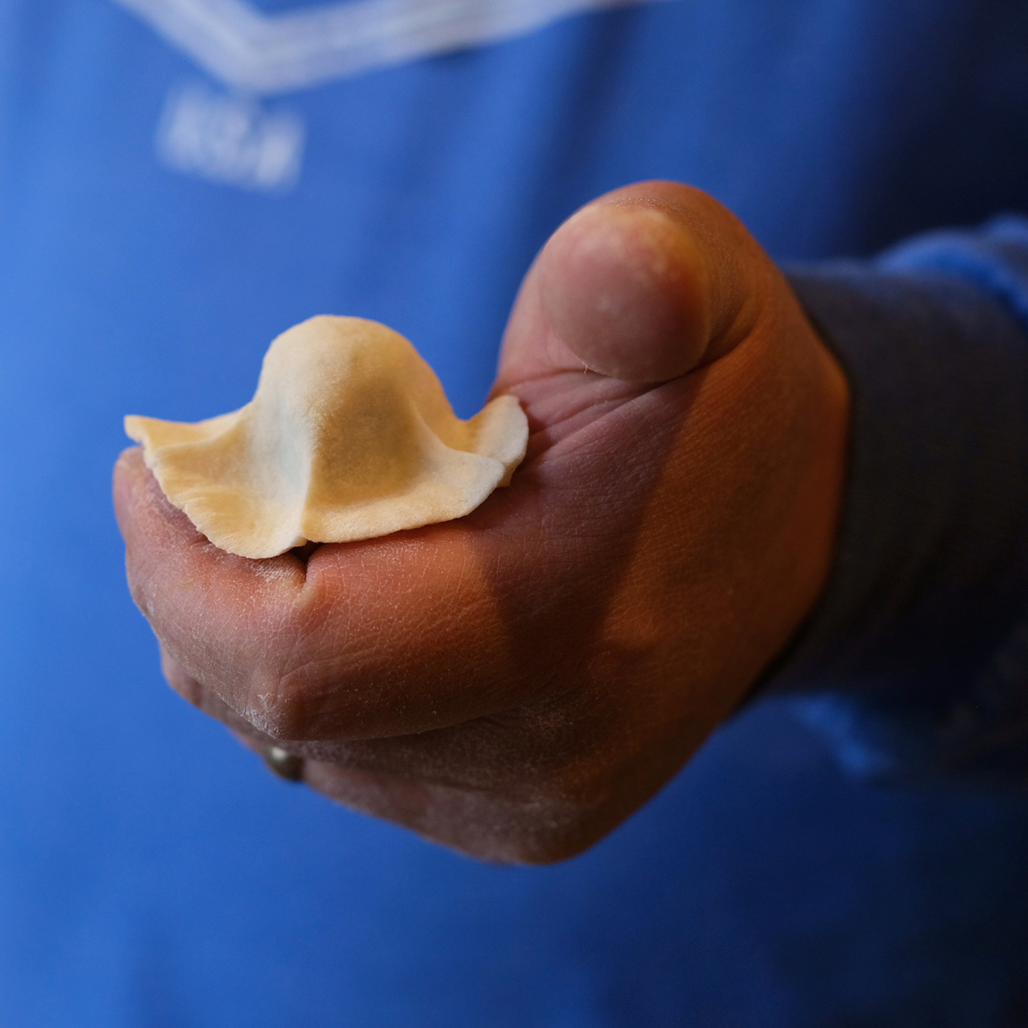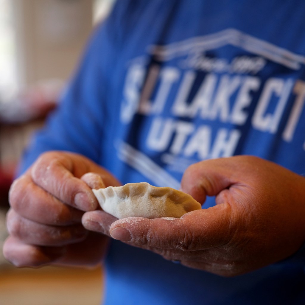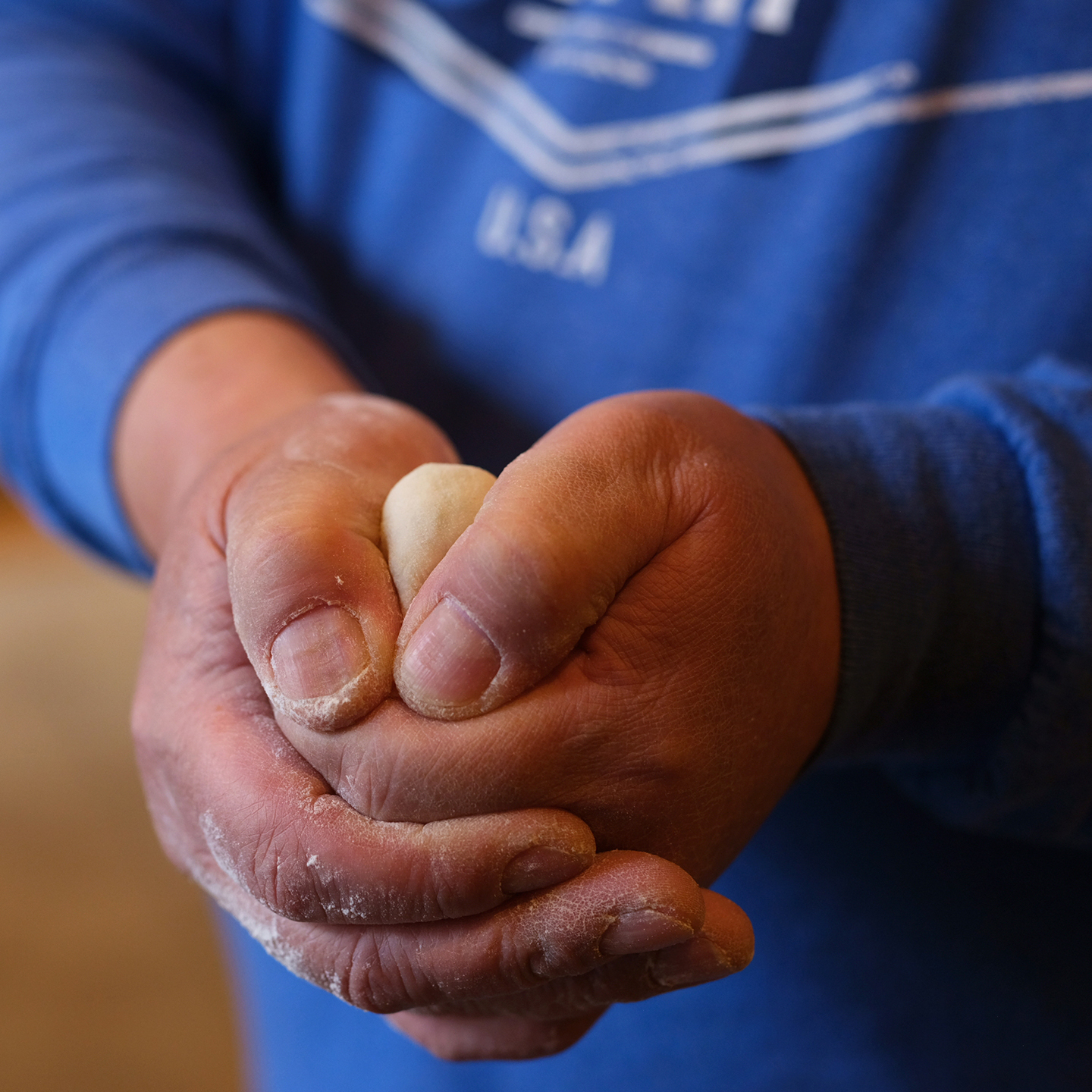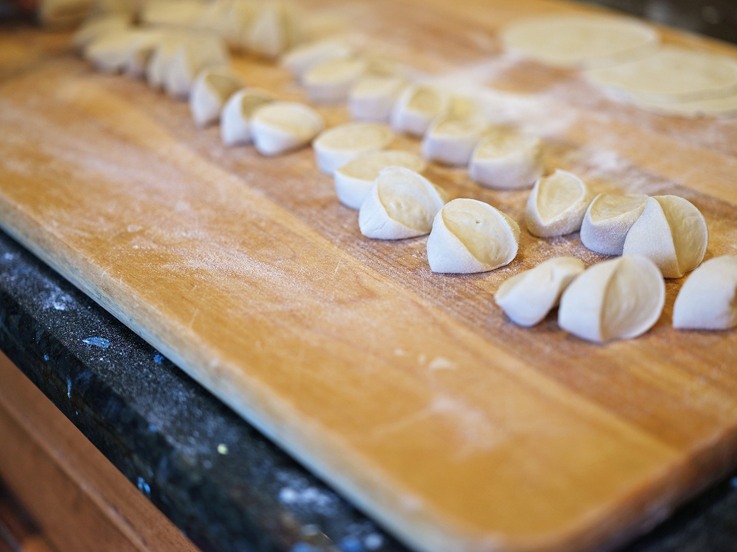 Technically, this pinching method alone should suffice. However, for a super-secure fold, we like to double down with the following technique: place folded dumpling edge flatly along your left index finger, pressing firmly with your thumbs to secure contact of the crust. Pinch down and push the belly of the dumpling together; this will make a rounder shaped dumpling.