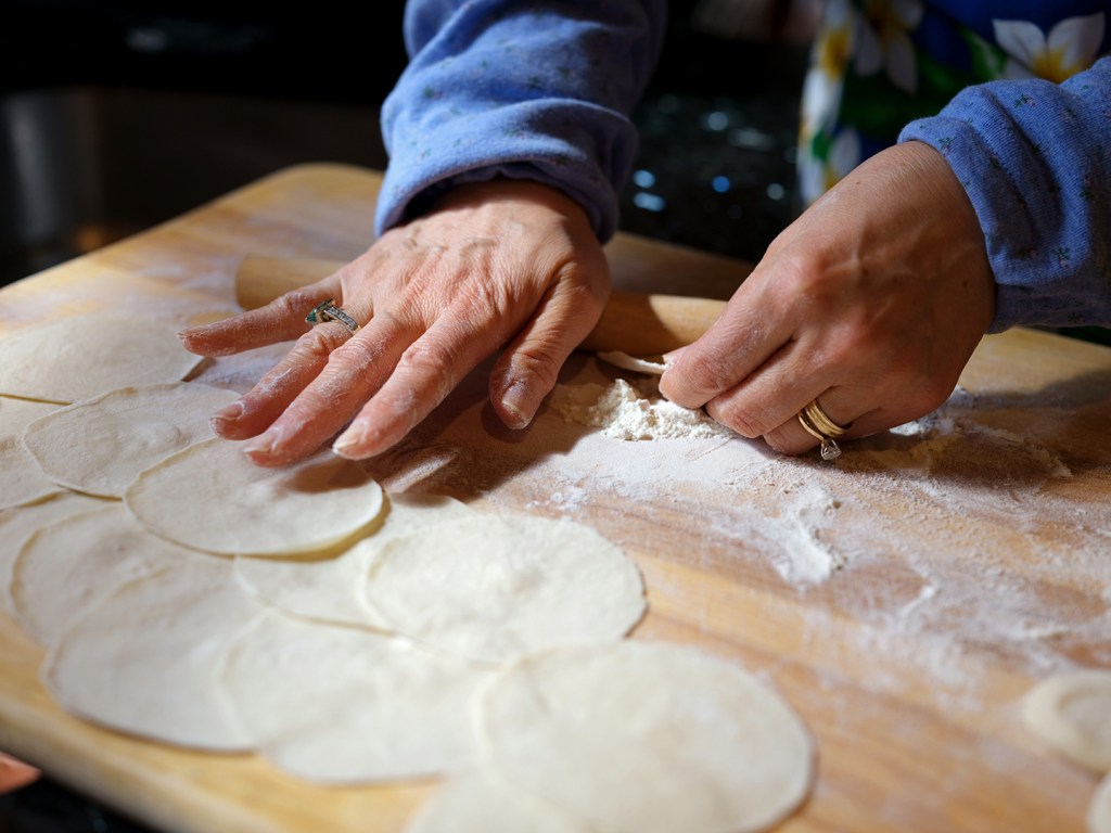 To roll the individual dumpling dough, take a mini-pancake and roll with a small rolling pin inward four times, once on each side of the pancake. Imagine the dough exists in quadrants: for example, there’s a North, East, South, and West side. Roll inward on each quadrant once (NESW), and then in the same order a second time (NESW). Make sure you have a liberal amount of flour beneath your pancakes to prevent sticking.
