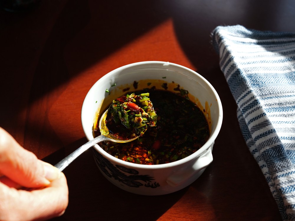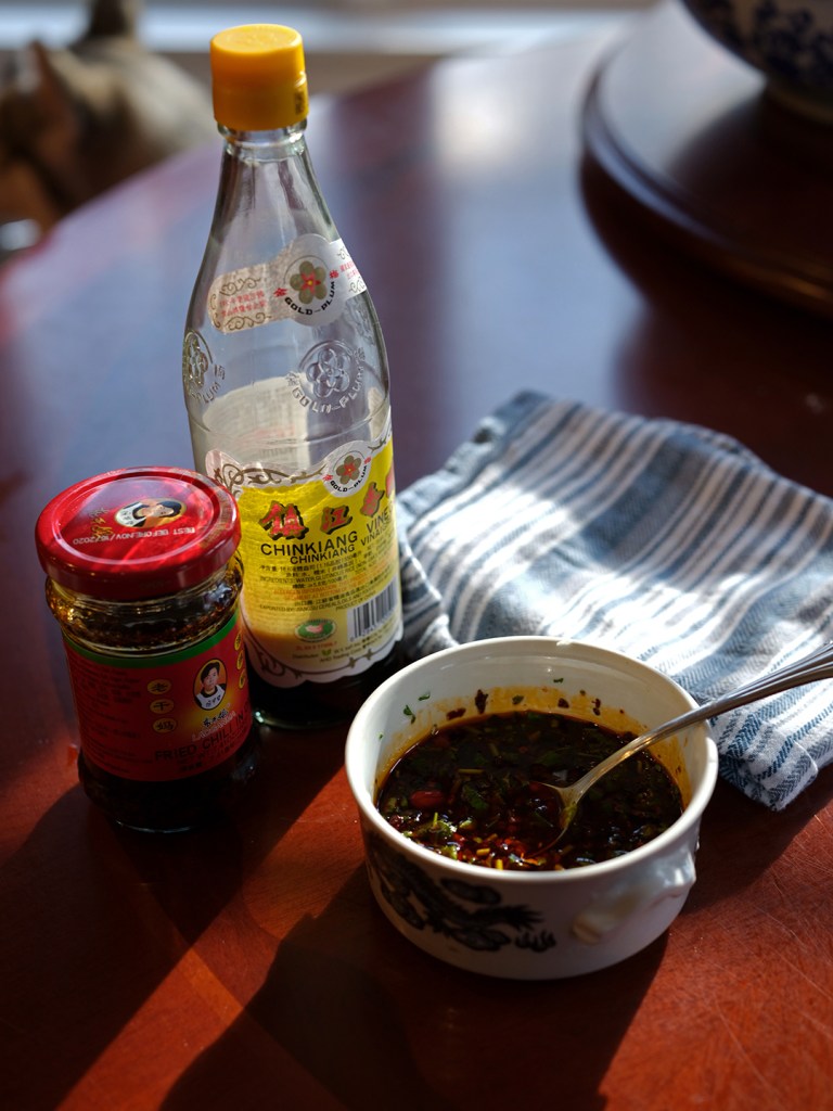 In a small sauce pan over high flame, heat 1-2 tablespoons of olive oil. Drizzle this hot oil over the cilantro and garlic. Add in 1/4 cup of soy sauce, 1/8 cup of Chinese black vinegar, 2 tablespoons of fried chili mixture, and a dash of sugar. Stir together, add a splash of water to dilute the sauce, and set aside.