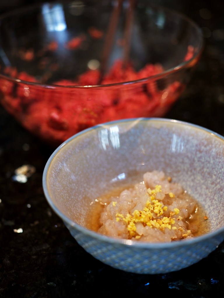 Begin mixing the meat in one direction to elongate the ‘fibers’ of the meat lengthwise. This method will allow for maximum consistency of texture and taste across the filling. While mixing, add in 1/3 cup of cold water in small increments to ensure a sticky filling, which in turn ensures a juicy dumpling. We’re adding in some water to this recipe because chives don’t produce much water when cooked. If we were to use vegetables with higher water content, we would skip the addition of water here. Stir in 6 ounces of chopped raw shrimp last to maintain as much of the natural shrimp flavor as possible. Use the same one-directional stirring method throughout.